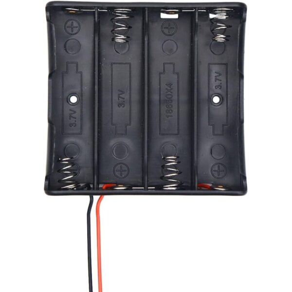 This battery case can hold 4 x 18650 batteries that can be used as a 14.8 V power supply for your electronic circuits. Combined with four 18650 batteries, it makes a perfect power supply for outdoor environments and small robots.